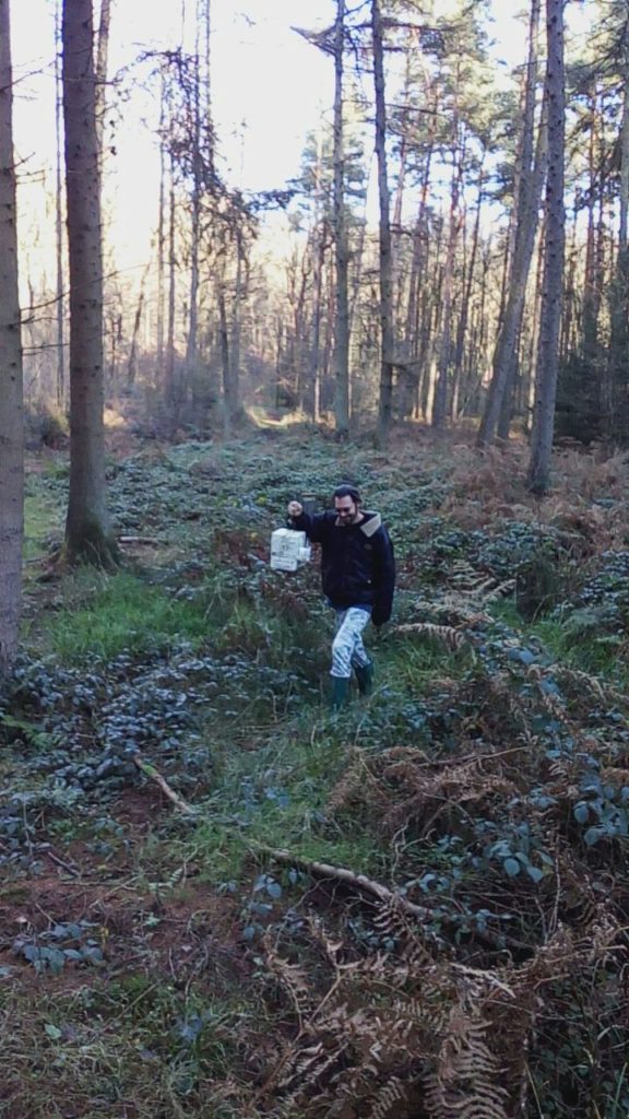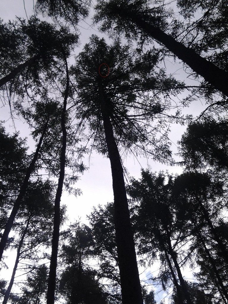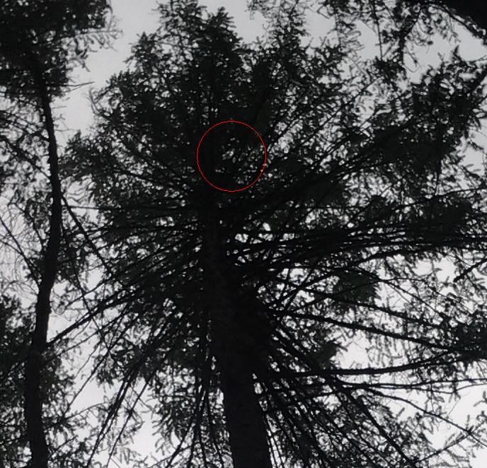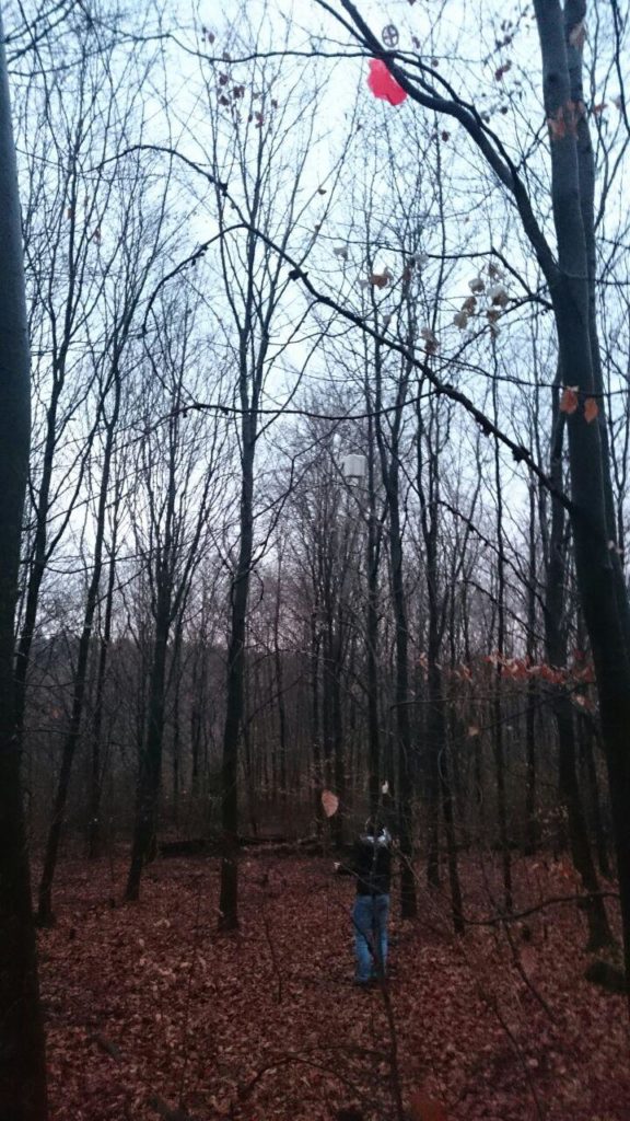 Bis 400 m vor der Prediction war kein ausreichendes Signal zum dekodieren, sodass ich erst dann die Gewissheit hatte, dass die Sonde im Wald war. (Wie sich im Nachgang herausstellte, keine 5 m von der Prediction) Allerdings zumindest in einem nicht so dichten Laubwald, irgendwo zwischen Unterholz und echtem Wald. Das Auto also auf dem naheliegenden Bauernhof geparkt wo wir von drei Hunden in Ponygröße begrüßt wurden und unsere Anwesenheit erklärten. Von dort aus über die Wiese in den Busch geschlagen hing der Fallschirm in ca. 7-8 Meter Höhe an einem Ast, die Sonde ca. 3 m darunter. Rütteln am Baum bewirkte, dass sich die Sonde zumindest um einige Dezimeter absenkte.
