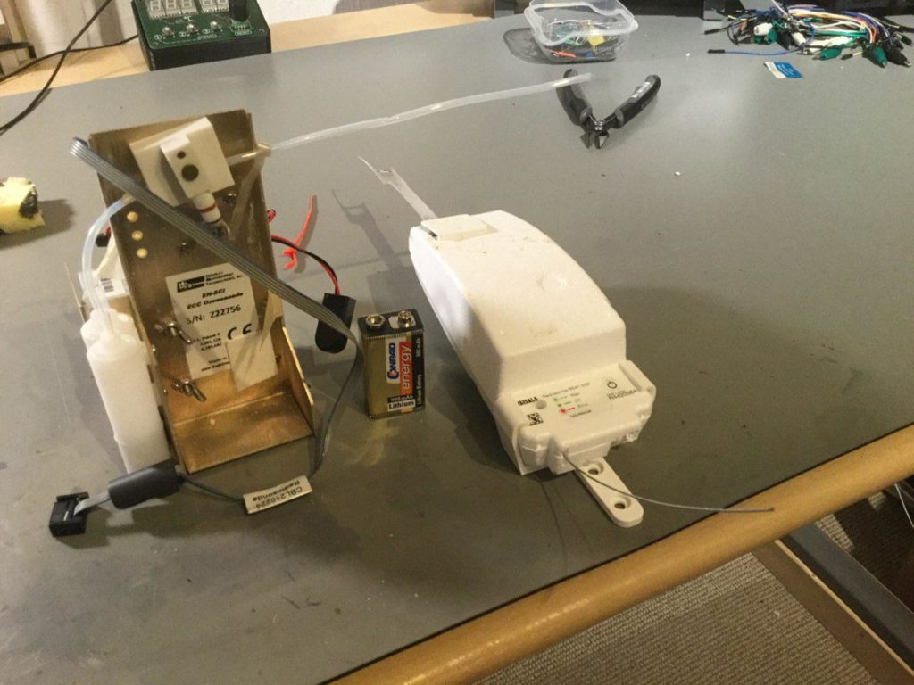 Die Sonde sieht so aus, als hätte sie länger im Freien gelegen. der Ring oben ist angerostet und sie hat einen interessanten Eigengeruch. Die Wasserbatterie war diesmal vorhanden, nicht so wie bei De Bilt wo ich beim Auspacken enttäuscht wurde, und diesesmal ist auch eine Heizbatterie vorhanden. Es ist ein 9V-Lithium Block Marke Conrad Energy – wusste gar nicht, dass Conrad auch in Belgien verbreitet ist.