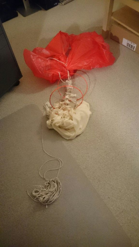Da das Astwerk, an dem der Fallschirm hing und die Sonde vom Absinken abhielt, relativ dünn war, wurde der Plan geschmiedet, mit einem der herumliegenden, dicken und langen Äste die Sonde herunterzudrücken. Leider waren die meisten bereits so morsch, dass sie beim Anheben zerbrachen. In einiger Entfernung hatte ich Glück und fand einen langen Ast, der bei einem jüngeren Sturm umgeknickt sein musste, nur noch mit einem Stück Rinde am Stamm hielt und etwa 6 m lang war. mit vereinten Kräften zur Sonde getragen und oben die Äste so abgemacht, dass eine Y-Gabel entstand, die man um die Sondenschnur herum auf die Sonde legen könnte, um diese dann herunterzuziehen. Der Plan funktionierte auch und als die Sonde unten war konnte sogar noch der Fallschirm durch Ziehen an der Schnur unbeschädigt heruntergeholt werden. Die Totex-Schirme sind massiv; die großen roten aus Plastik von BW und KNMI wären dabei bestimmt kaputt gegangen. Einziger Verlust ist der Temperatursensor, dass ist ja für Baumlander eher die Regel als die Ausnahme, besonders wenn man Gewalt anwenden muss.