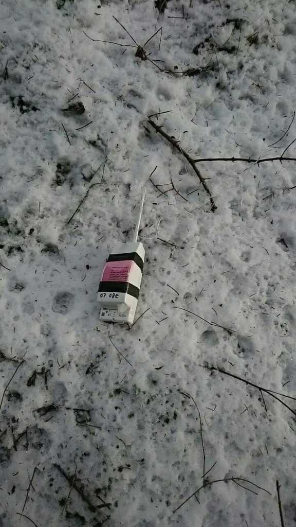 Heute bot sich das Wetter an und ich unternahm mit einem Freund, der mit Angeln umgehen kann, eine Nachkontrolle. Der Fallschirm war verschwunden und auch am Boden unter dem Schnee nicht zu sehen, vermutlich war er schon heruntergekommen und mitgenommen worden. Grobe optische Nachkontrolle um die interpolierte Position brachte nichts, und an der Sondenschnur, die wir erangelten hing auch nichts mehr. Bevor wir aufgaben, noch eine genaue optische Kontrolle. Und tatsächlich, nicht weit vom Weg lag die Sonde, sogar auf dem Schnee. Sie kann also erst in den letzten paar Tagen runtergekommen sein. Der Sensorarm war zu bemitleiden, aber beim Anschalten zeigte sie keinen Fehler an.